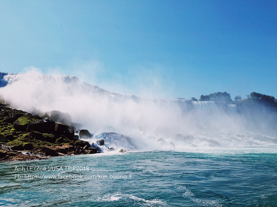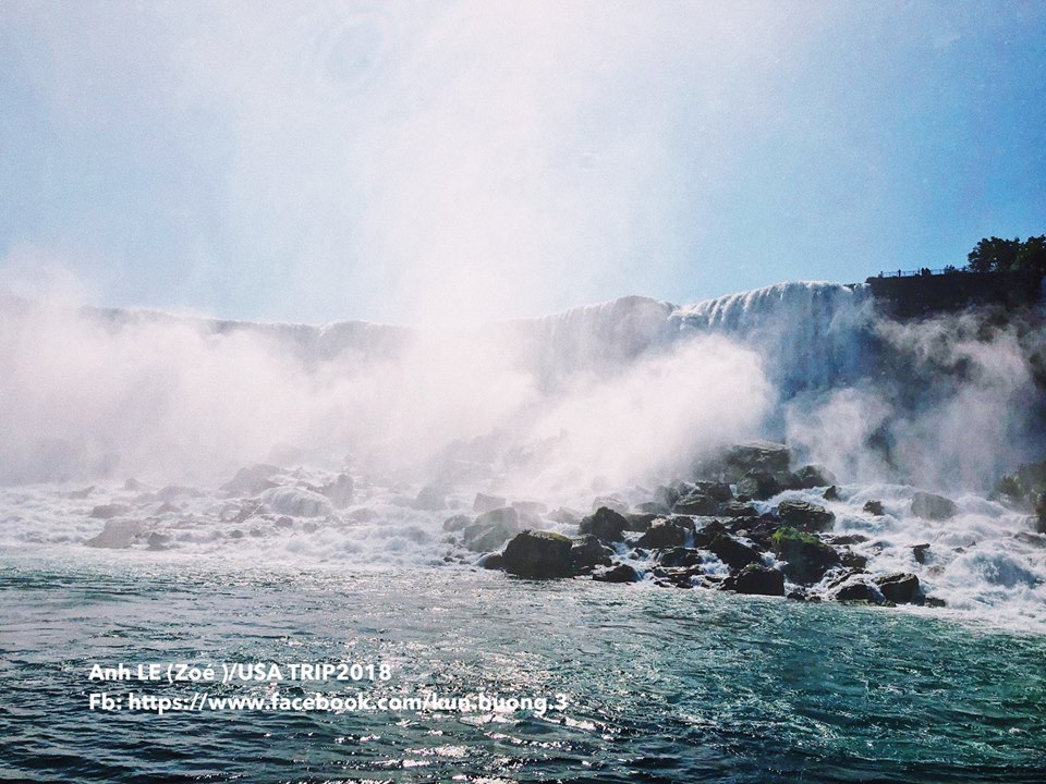 MAID OF THE MIST là công ty du thuyền (cruise) khai thác mạn bên Mỹ, có đồng phục áo mưa màu xanh nước biển, đội bên Canada là màu đỏ. Bạn sẽ được đi cruise xuống sát chân thác. LƯU Ý là đến phần này nếu điện thoại không chống nước thì cứ cẩn thận, ra đến sát chân thác, chân tay sẽ ướt sạch, nước táp vào mặt chẳng nhìn thấy gì đâu (do mình đứng đầu thuyền) còn đâu là khuyên dùng GO PRO chỉnh lên 4k mà quay phim nhé, nếu không phí cả đời, chân thác đẹp cực kì, nước bắn cộng hơi nước cũng rất dày. Khuyên các bạn cố gắng đứng ở đầu thuyền vì hướng tiến về thác, phía đầu thuyền có ánh sáng cực đẹp, khi quay về ánh nắng phản chiếu lại không đẹp bằng. Sau khi kết thúc cruise bạn sẽ được thả xuống. Bạn sẽ nhìn thấy ngay 1 chuỗi cầu thang đưa bạn lại gần sát phía thác hơn, tuy nhiên để chụp ảnh thì hơi khó vì người đông như quân Nguyên.